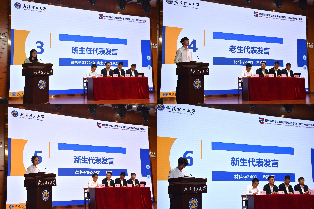 随后,材博sy2401王含笑作为老生代表发言。他回顾自己大学阶段的科研之路,勉励同学们抓紧大学阶段的宝贵时光,展现青春作为,彰显青春风采,贡献青春力量。微电子本硕2401班郭轩代表微电子科学与工程实验班新生发言,她讲述入校以来的所见所闻,在憧憬未来的学习生活中,并做出追求真知,报效祖国的承诺。最后,材科sy2401班郝宇辰同学作为材料科学与工程实验班新生代表则向全体新生提出了以下几点倡议:乐观开朗,积极向上;独立思考,批判思维;严于律己,科研报国。