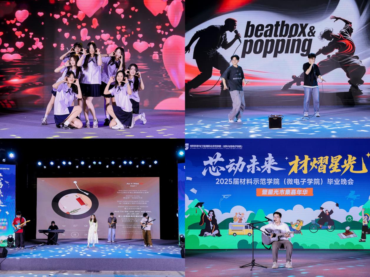 晚会节目精彩纷呈,深情与活力交织。开场歌曲《我们的明天》以悠扬旋律唱响毕业生对未来的无限憧憬;说唱《我像一个傻瓜》用呐喊诠释了无畏的青春勇气;《红日》《茉莉雨》等经典独唱直击人心,引发全场共鸣。团队舞蹈《等你的回答》展现默契与活力;创意节目Popping与Beatbox的激情碰撞、脱口秀的幽默叙事、吉他弹唱《南山南》的温情脉脉,不断点燃现场气氛,掌声与喝彩此起彼伏。终场乐队倾情演绎《As it was》,当最后一个音符融入夜色时,毕业生们怀揣着祝福与同窗的情谊,在星光下正式启航新的人生征程。